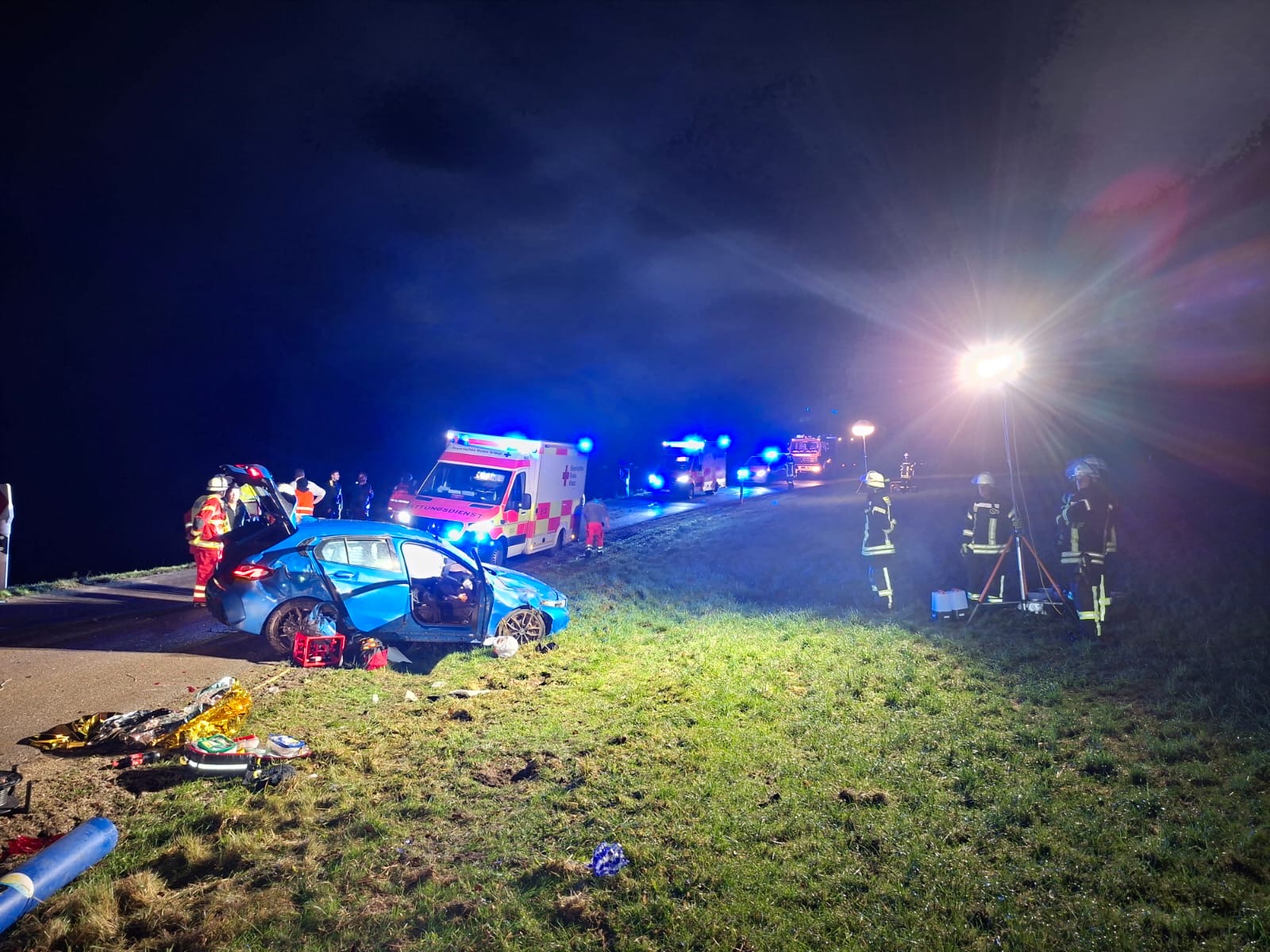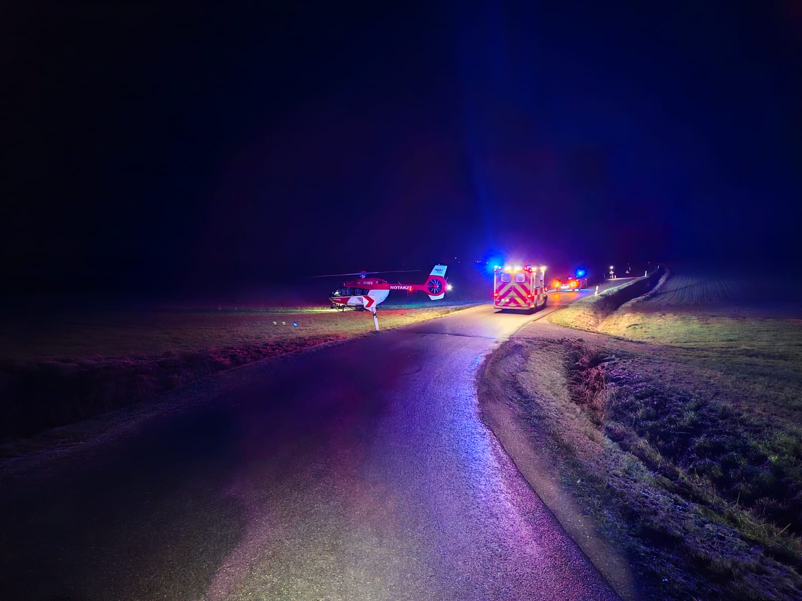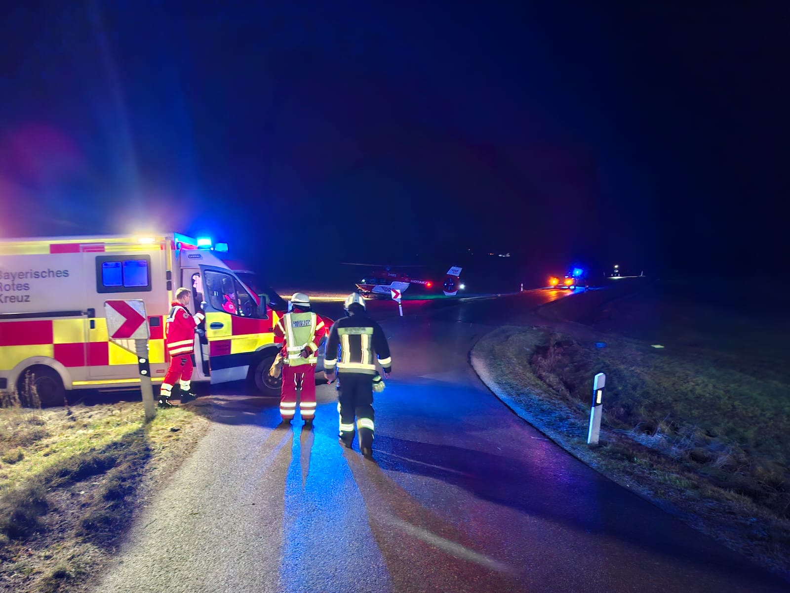 Unsere Kameraden unterstützten weiterhin den Rettungsdienst, die mit 3 Rettungswagen anwesend waren. Da eine Wirbelsäulenschädigung bei einem der Verletzten vermutet wurde, ist der Rettungshubschrauber aus München zusätzlich alarmiert worden. Dieser war nach nur 15min bereits an der Einsatzstelle. Diese tatkräftige Unterstützung erfolgte permanent solange, bis die 3 jungen Männer zum Abtransport in die Krankenhäuser per Rettungswagen und Hubschrauber übergeben werden konnten.