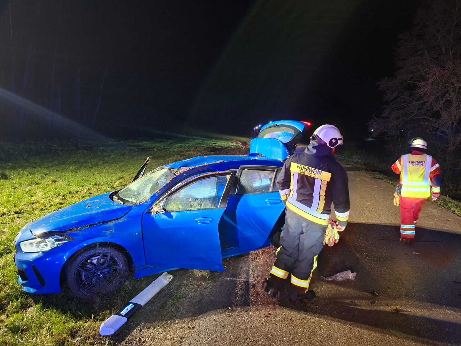 Vor Ort angekommen, stellte sich heraus, dass es sich um 3 junge Männer handelt, die verschiedenste Arten von Verletzungen aufwiesen, sodass die Kameraden der FF Langwaid sofort mit den Erstversorgungsmaßnahmen begannen. Gleichzeitig wurde zur Vorsichtsmaßnahme der Brandschutz für das Unfallfahrzeug von unseren Kameraden aufgebaut, falls das Fahrzeug gelöscht werden müsste.